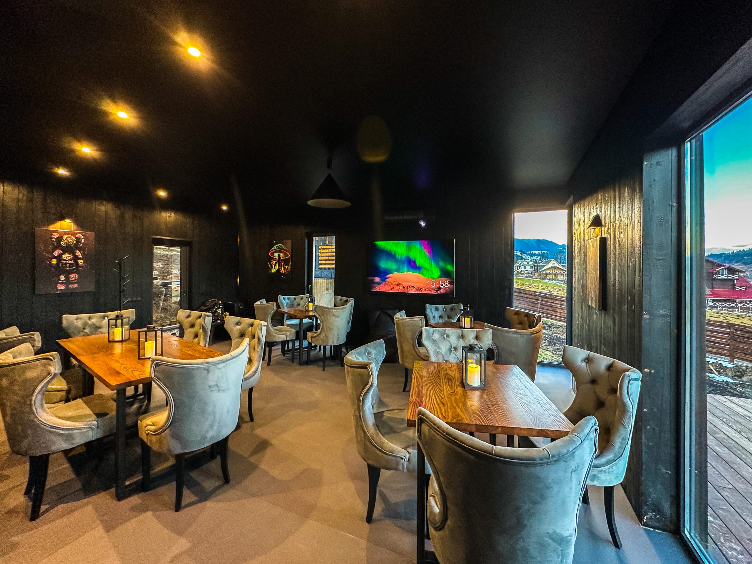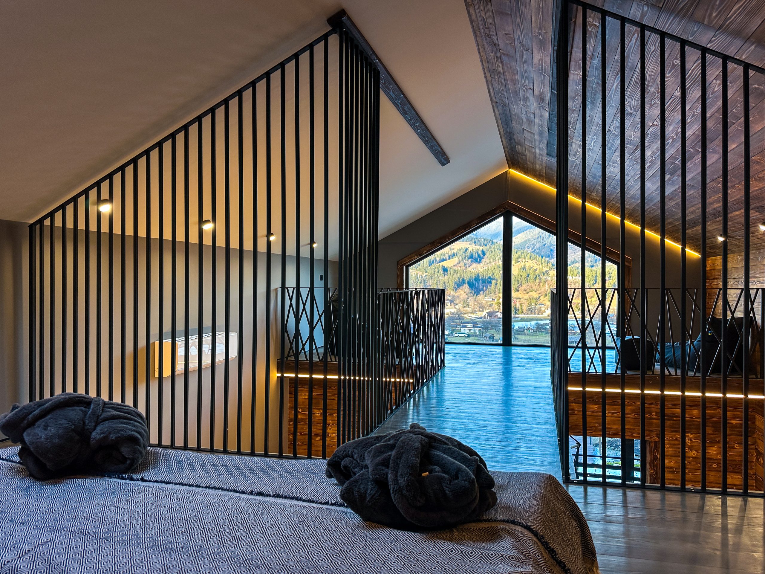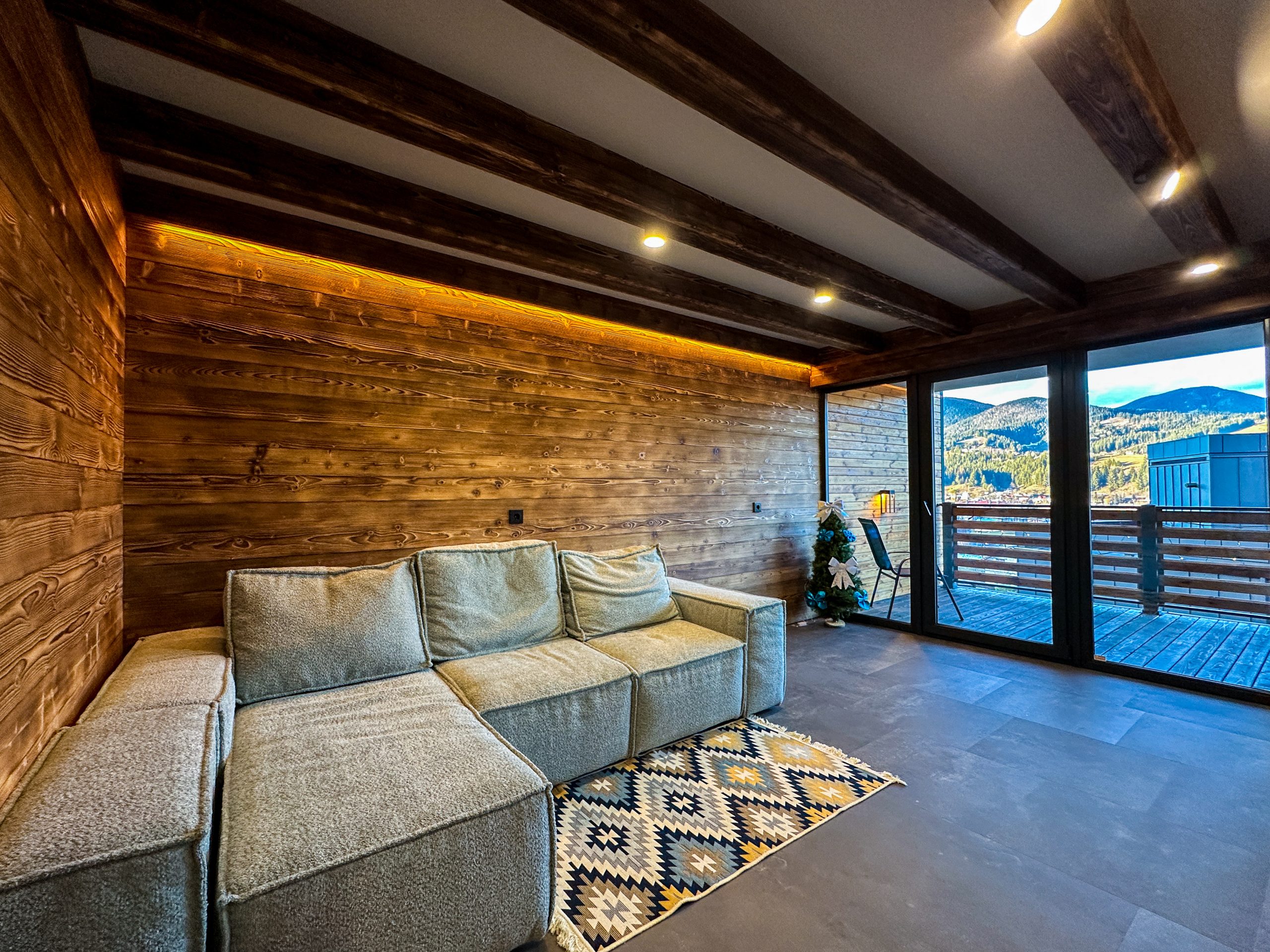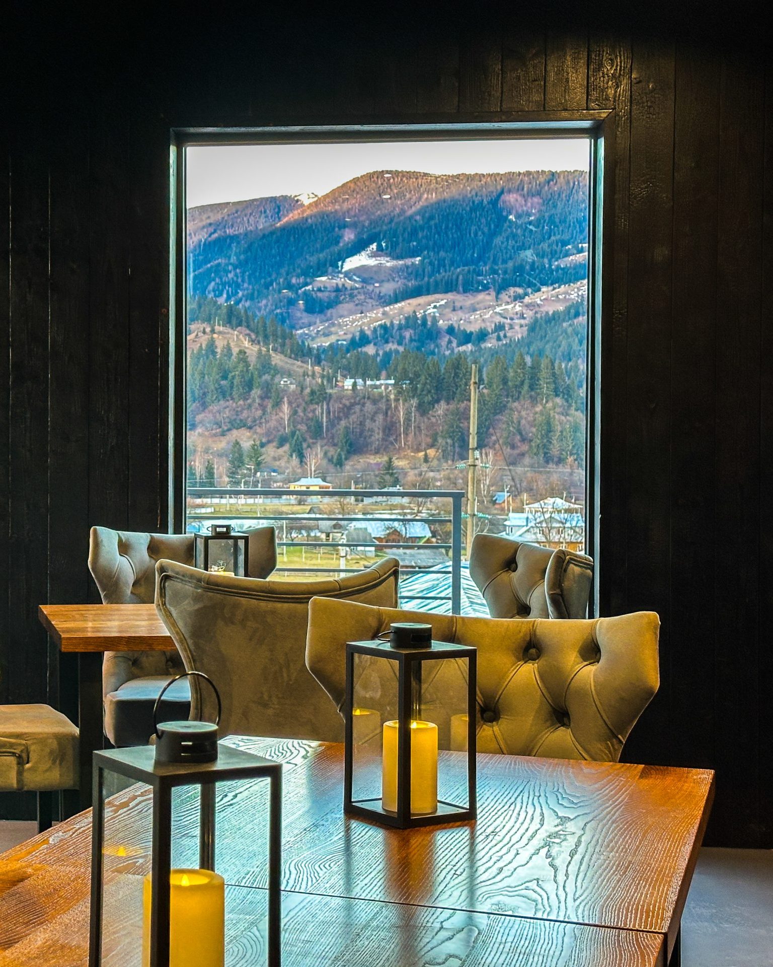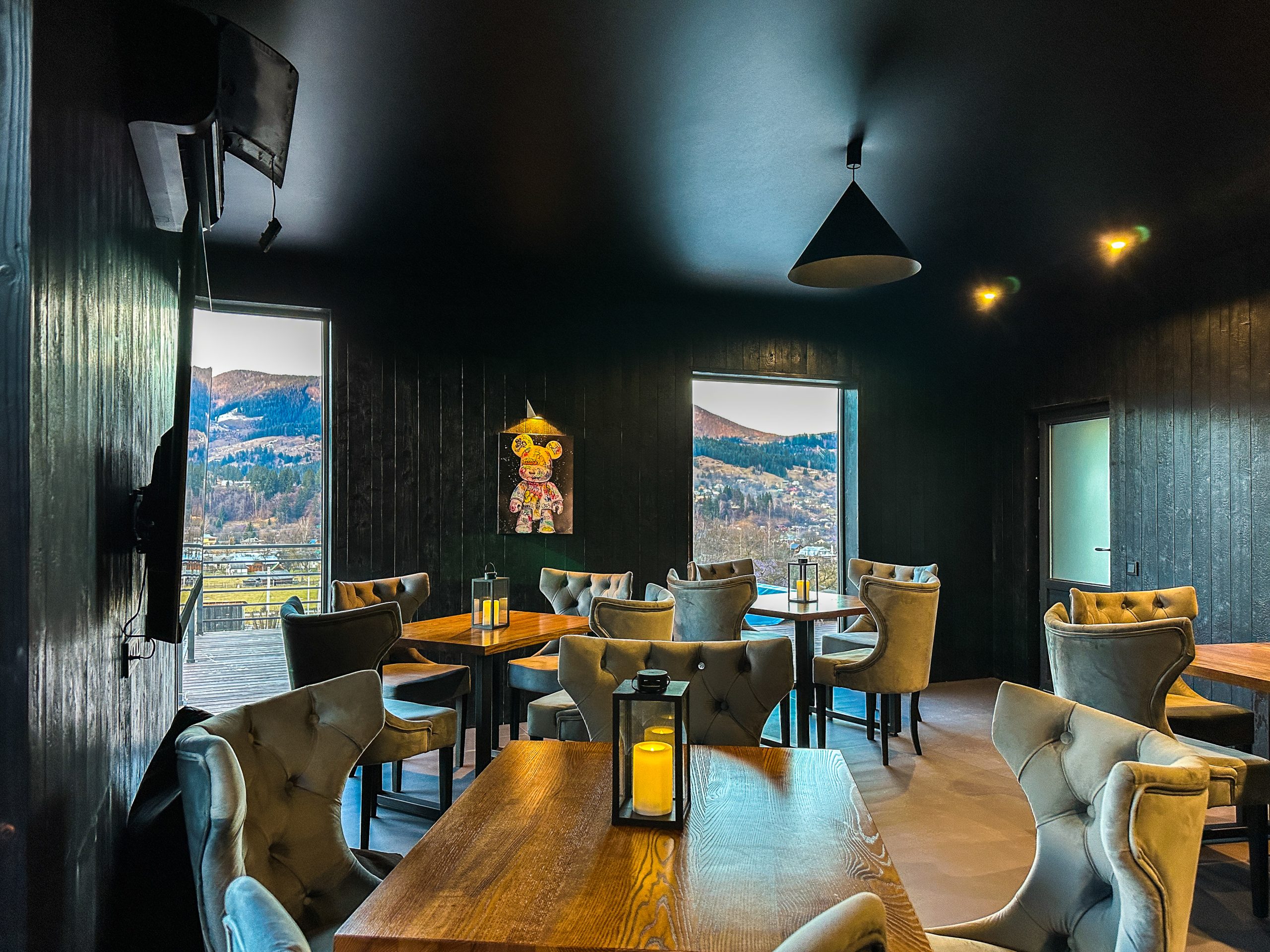 Світлий простір із великими вікнами, що відкривають мальовничі краєвиди гір, створює відчуття єднання з природою.