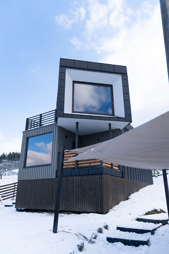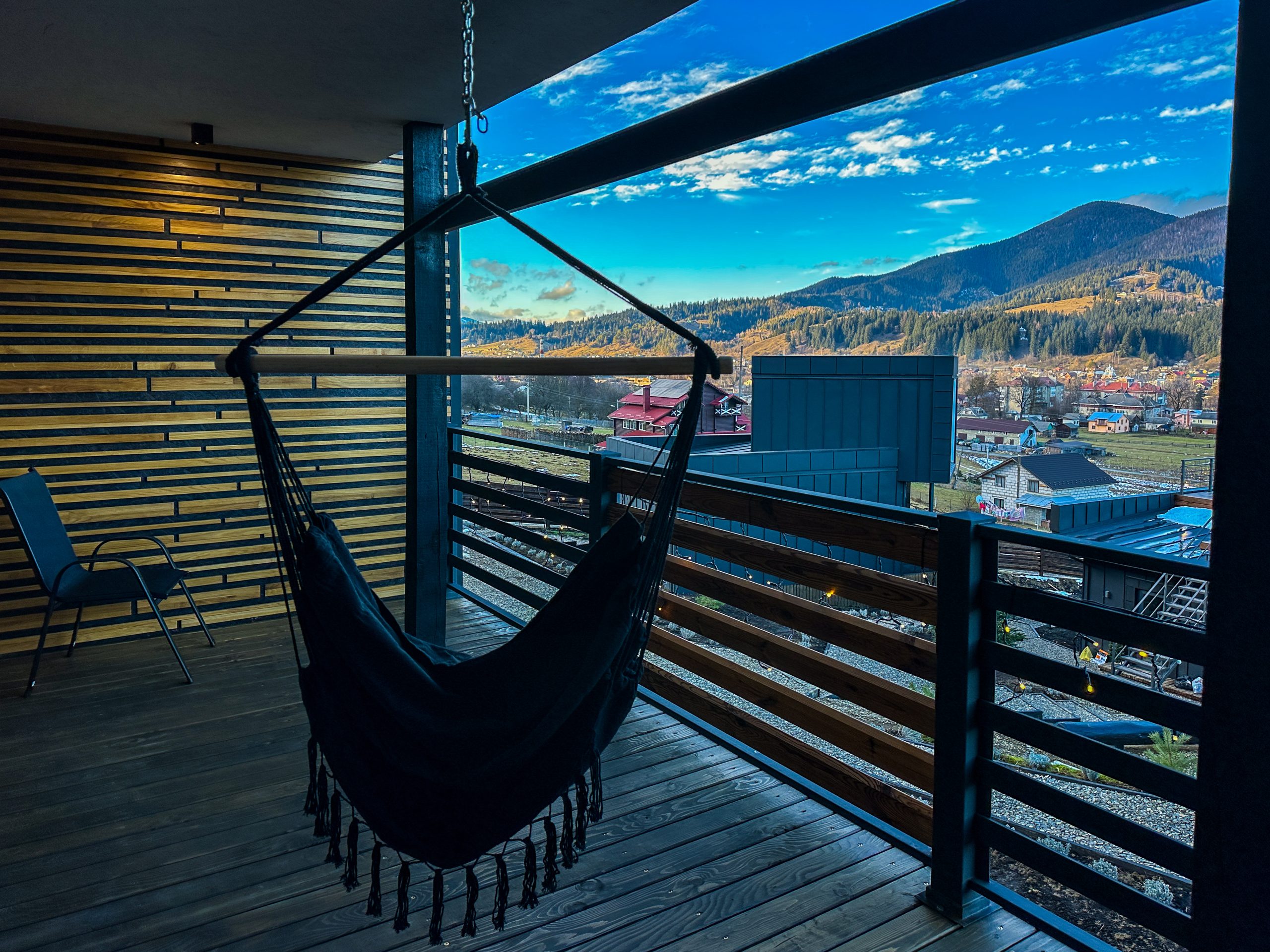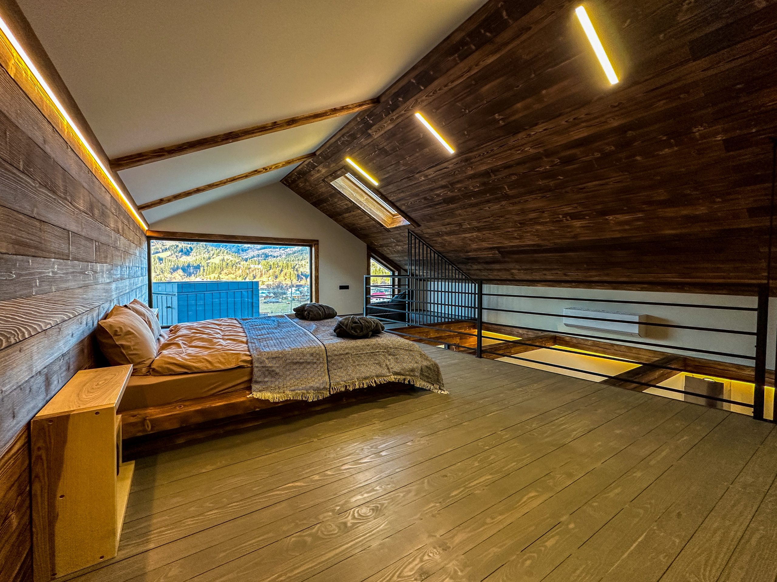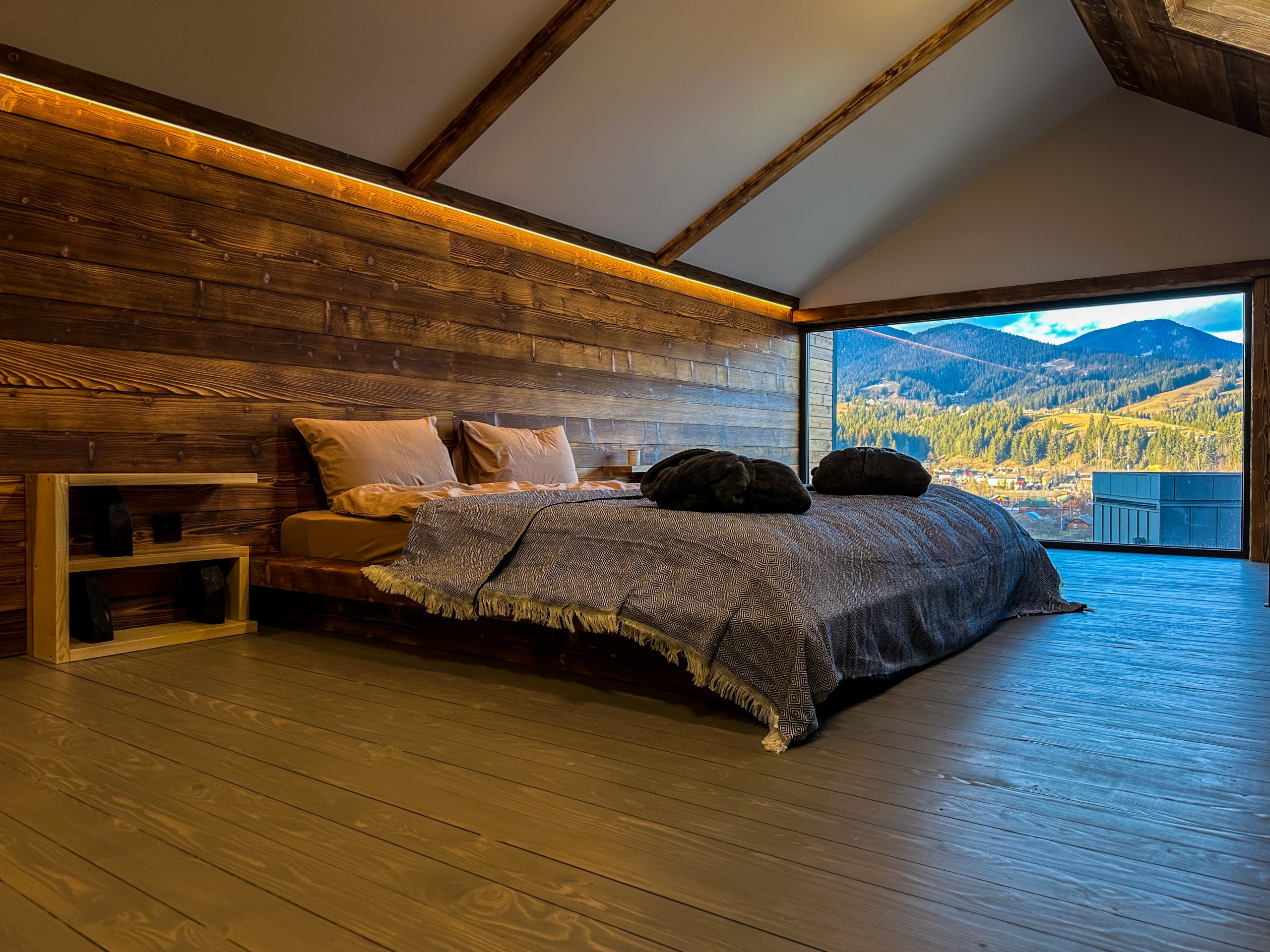 Світлий простір із великими вікнами, що відкривають мальовничі краєвиди гір, створює відчуття єднання з природою.