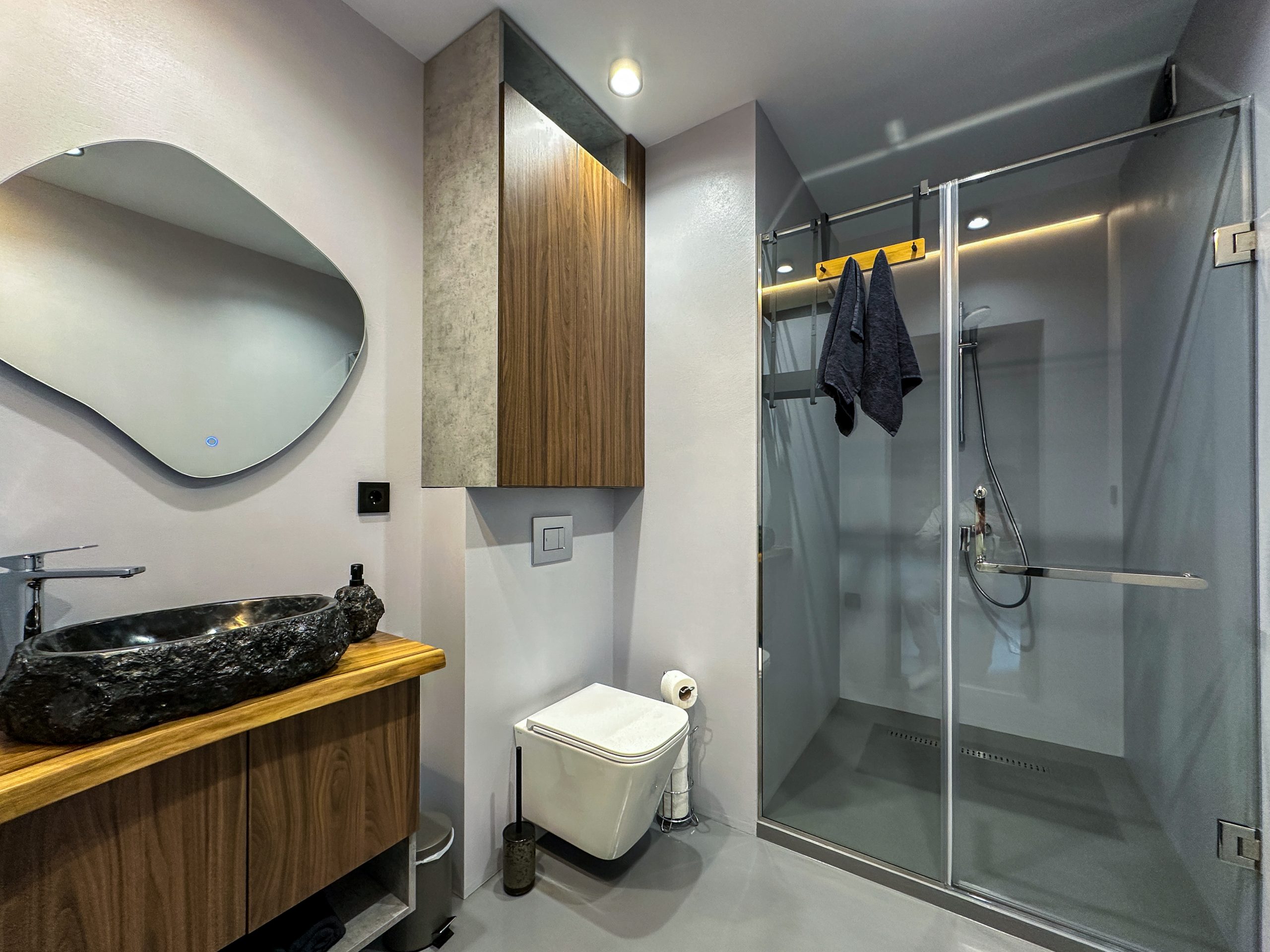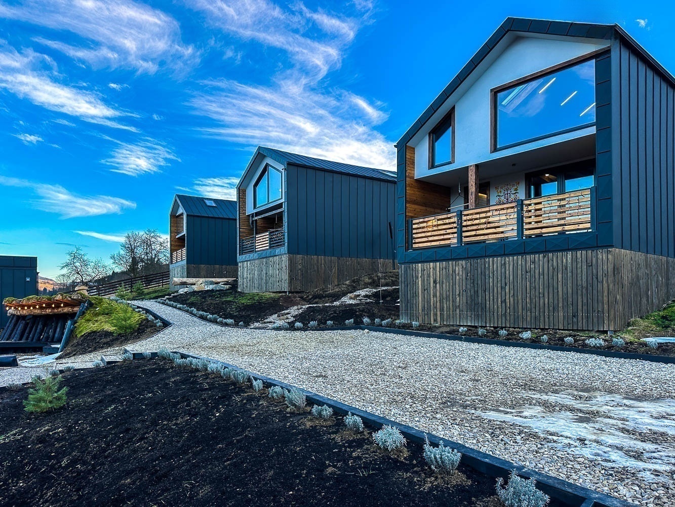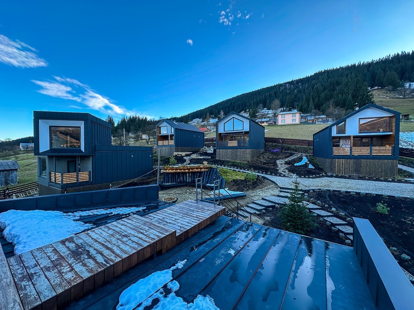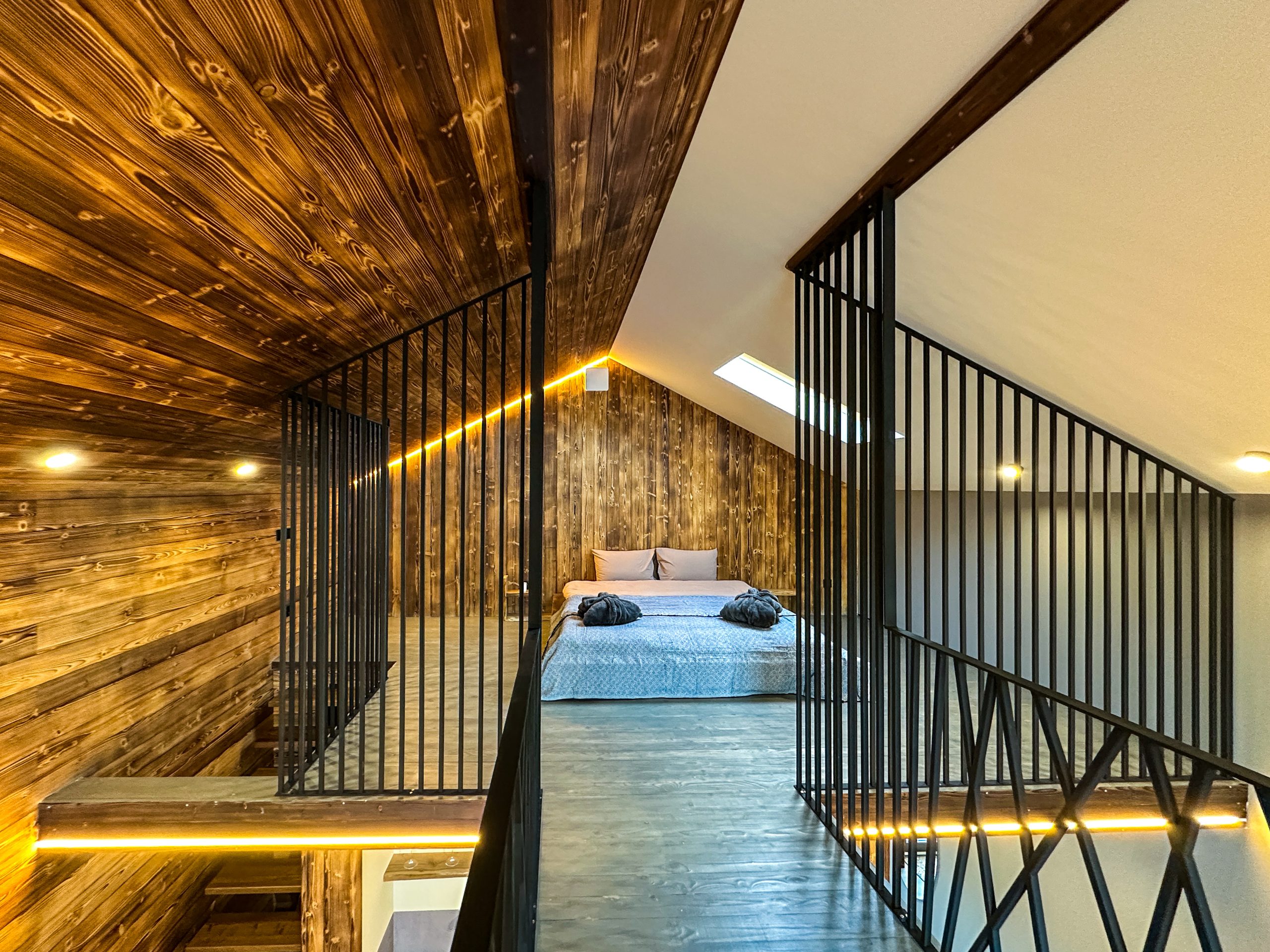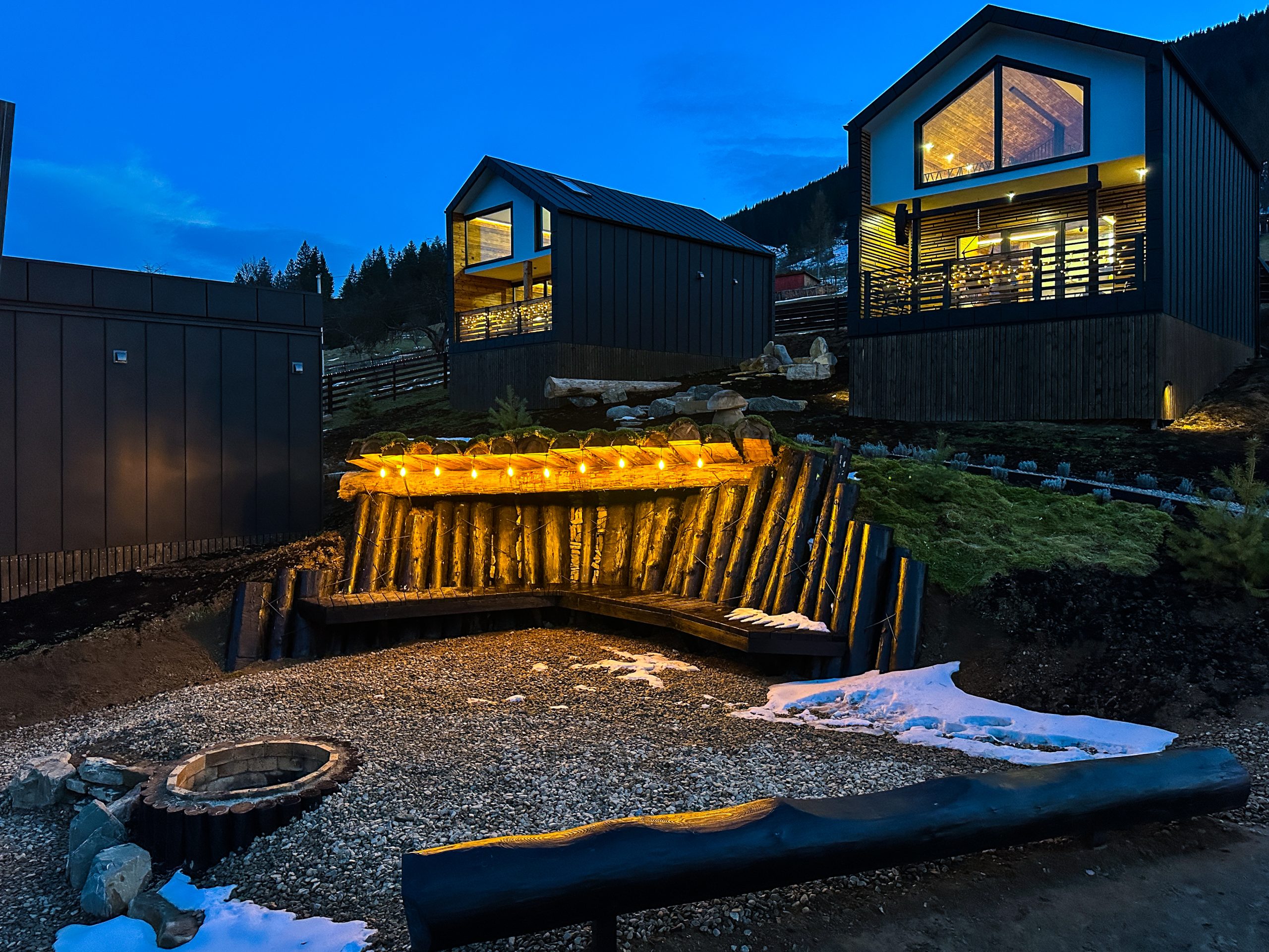 Світлий простір із великими вікнами, що відкривають мальовничі краєвиди гір, створює відчуття єднання з природою.